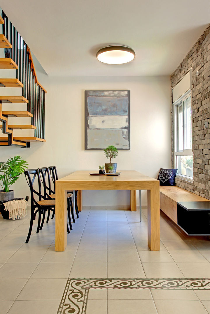 במקום שולחן מסורתי הצעתי להם פתרון הרבה יותר יעיל ומותאם אישית - קונסולה שנפתחת לשולחן ל12 סועדים. קיר טי וי שהיה צהוב, כמו כל הבית בעצם, קיבל טיפול מיוחד עם חיפוי אבן ורהיט שתוכנן במיוחד לפינה המשלב מזנון וספסל ישיבה גם יחד. בגלל התקציב הנמוך במיוחד - 50.000 ש"ח לא יכולנו להחליף ריצוף, לכן עשיתי עיטור קטן של אריח מצוייר שהיא מאוד אהבה במרכז הסלון ( בדיוק במקומות שקרמיקה קיימת הייתה שבורה בפינות). צבענו את מעקה המדרגות (שהיה זהב) לשחור ושילבנו נגיעות של שחור בחלל בריצוף תאורה ואלמנטים דקורטיביים אחרים.