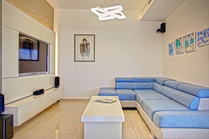 לבעלת הבית היה חשוב שהבית יהיה קל ונוח לתחזוקה לכן בחרנו במטבח עם חזיתות זכוכית ואריחים גדולים. יצרנו פינת משפחה צמודה למטבח עם טלויזיה וסלון עם מסך נגלל ומקרן שניתן לצפות בו סרטים עם כל המשפחה